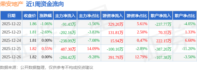 沪深股通持股方面,截止2025年12月26日收盘,荣安地产深股通持股数为4448.24万股,占流通股比为179.0%。